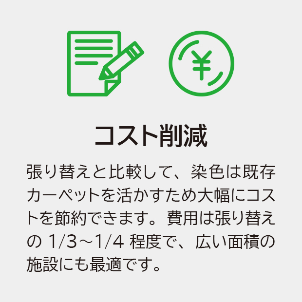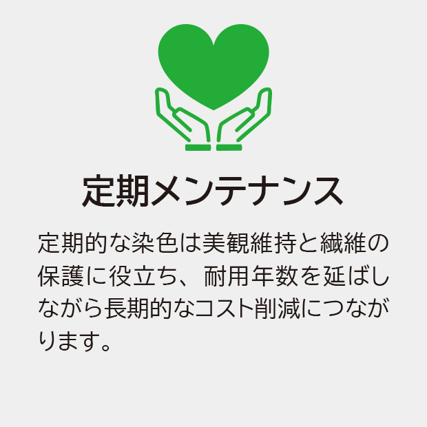 清掃・設備管理など、建物管理のプロフェッショナルである当社が、丁寧・確実な染色施工を行います。 - コスト削減+環境配慮のサステナブル対応