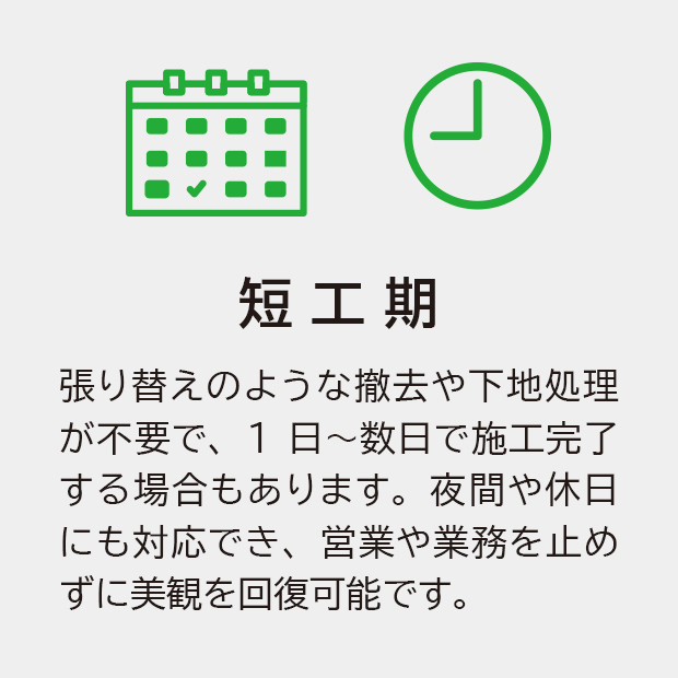 張り替えに比べてコストを抑えながら、短期間での施工が可能です。