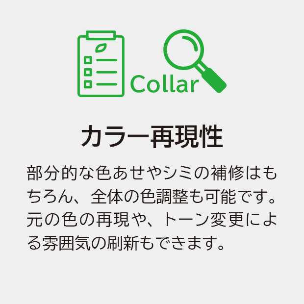 経年劣化や日焼けによる色あせ、頑固な汚れやシミなどで美観が損なわれたカーペットや絨毯に対し、部分的または全面的に染色を施すことで、まるで新品同様の仕上がりを実現します。